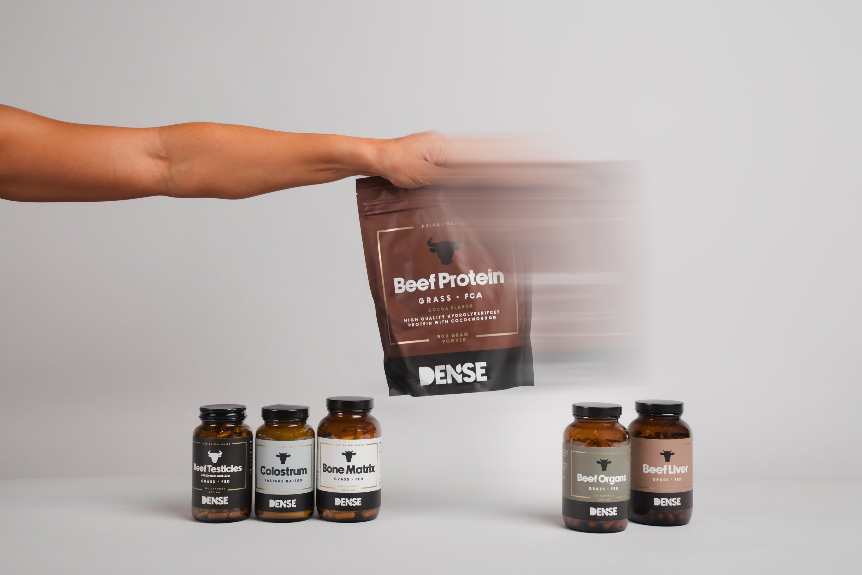 Vörurnar frá Dense eru fæðurbótaefni unnin eingöngu úr 100% grasfóðruðu nautgripapróteini. Vörurnar eru lausar við öll aukaefni, hormóna og önnur fylliefni